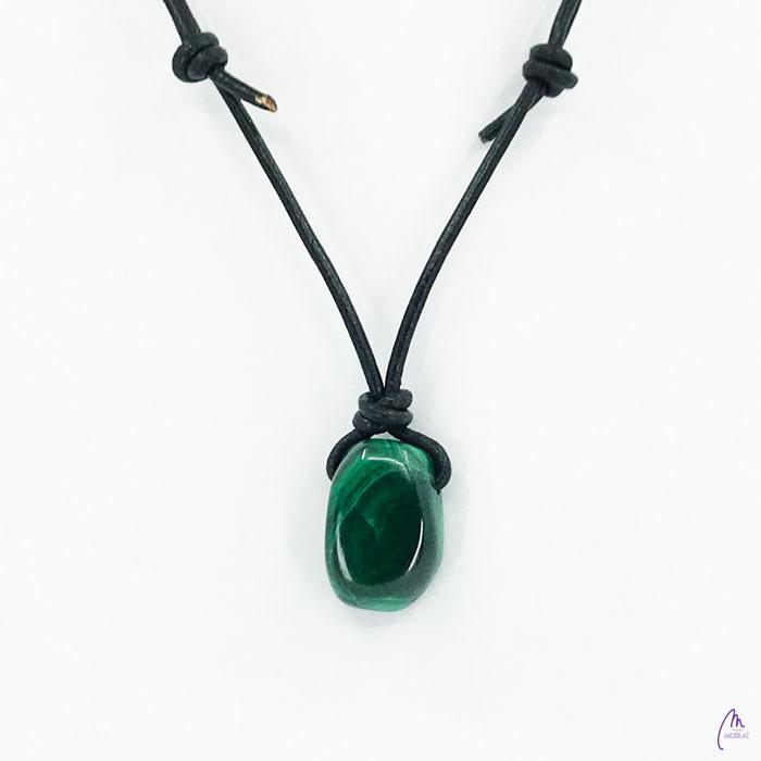 Unikaten obesek kolekcije Versy iz Malahita na črnem usnjenem traku s prilagodljivo dolžino (poteg vozla gor oz. dol).