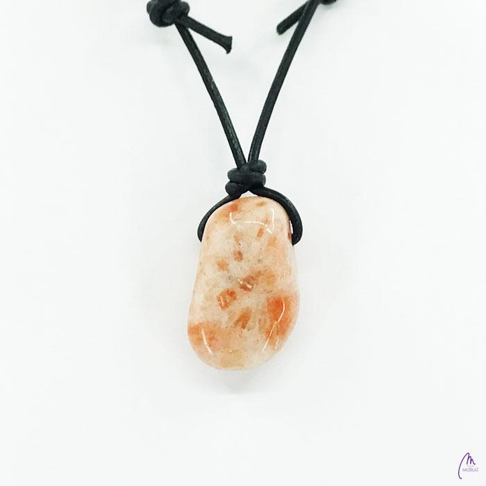Einzigartiger Anhänger aus der Versy-Kollektion in Sonnenstein an einem schwarzen Lederband mit verstellbarer Länge (den Knoten nach oben oder unten ziehen). Die Halskette ist unisex und für Kinder und Erwachsene geeignet.