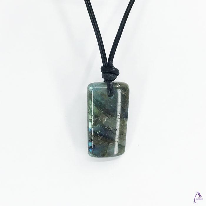 Unikaten obesek kolekcije Versy iz Labradorita na črnem usnjenem traku s prilagodljivo dolžino (poteg vozla gor oz. dol).