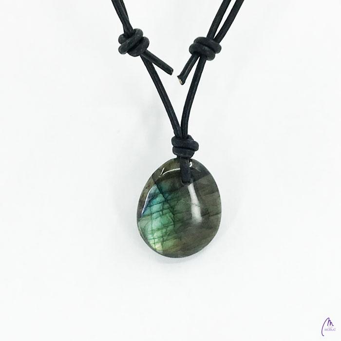 Unikaten obesek kolekcije Versy iz Labradorita na črnem usnjenem traku s prilagodljivo dolžino (poteg vozla gor oz. dol).