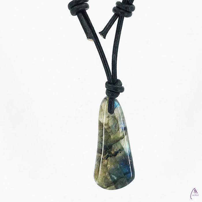 Unikaten obesek kolekcije Versy iz Labradorita na črnem usnjenem traku s prilagodljivo dolžino (poteg vozla gor oz. dol).