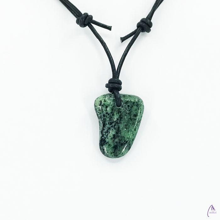 Unikaten obesek kolekcije Versy iz Zoisita na črnem usnjenem traku s prilagodljivo dolžino (poteg vozla gor oz. dol).